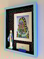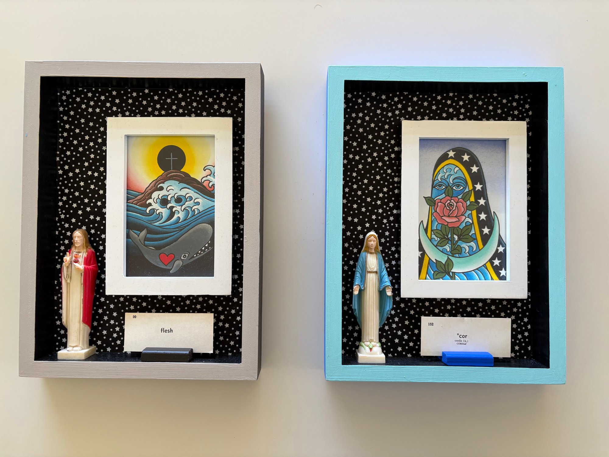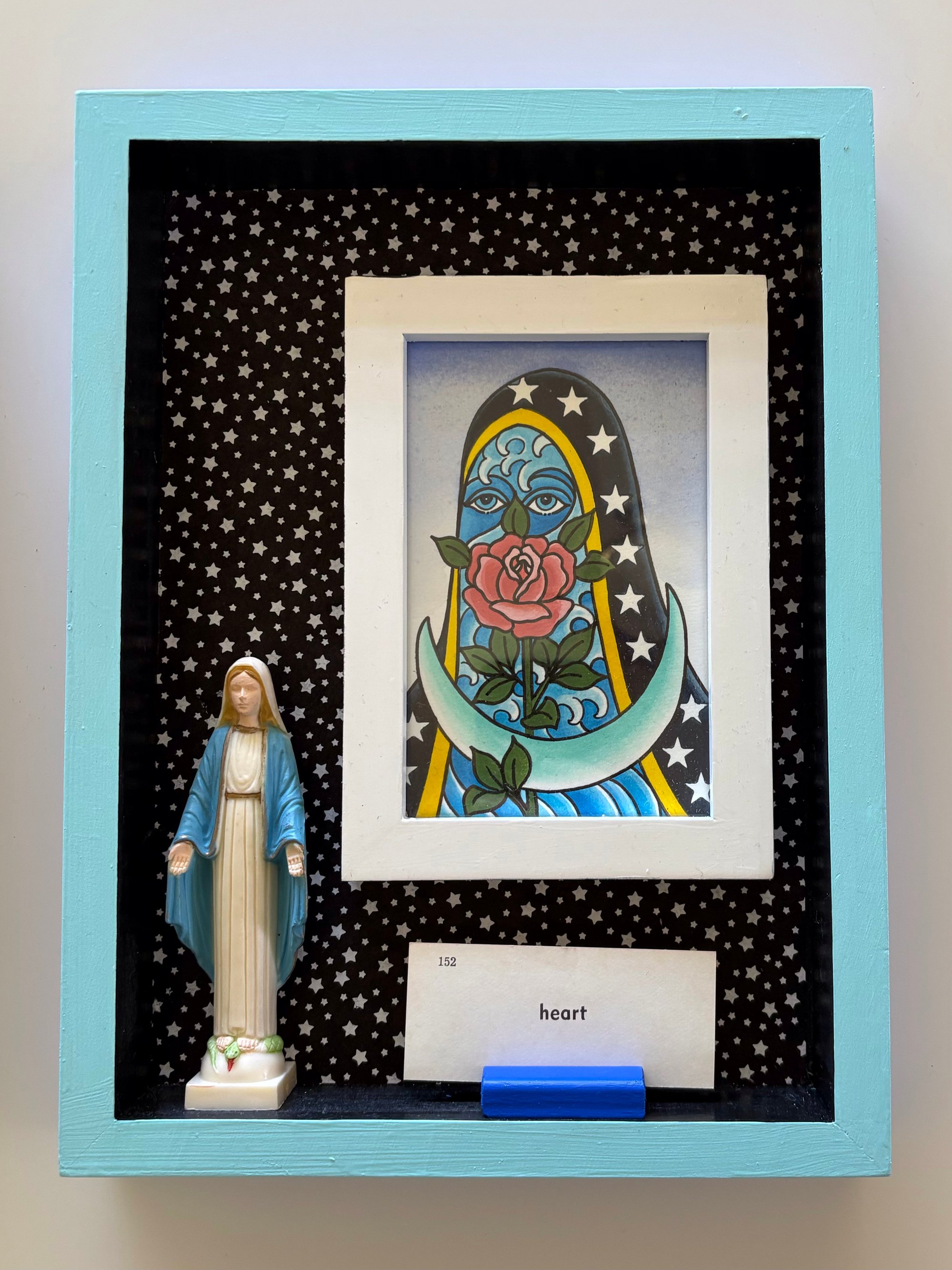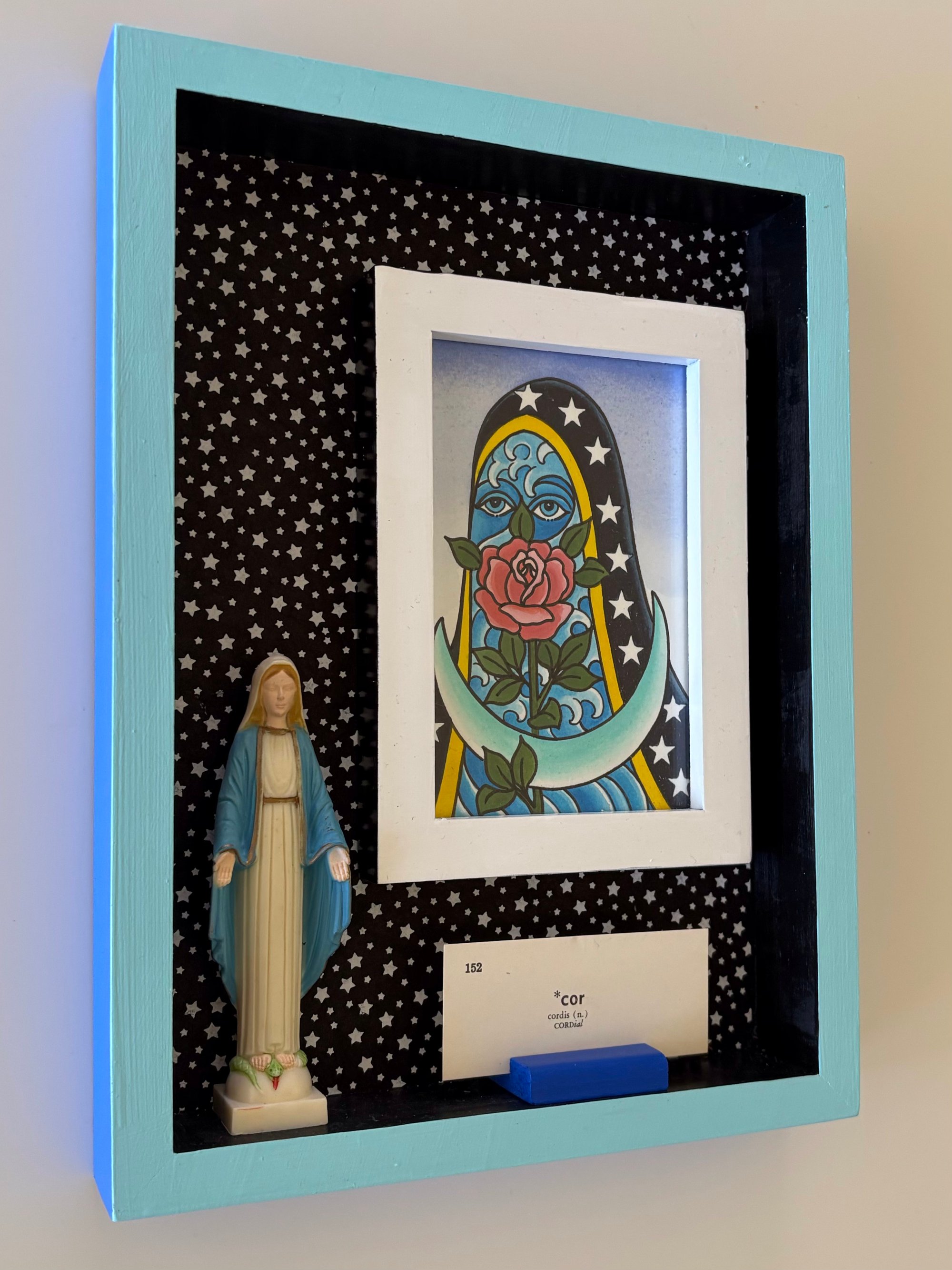 8x10” wooden frame with 3x5” acrylic painting, art paper, Mary Figurine and reversible vintage Latin flashcard